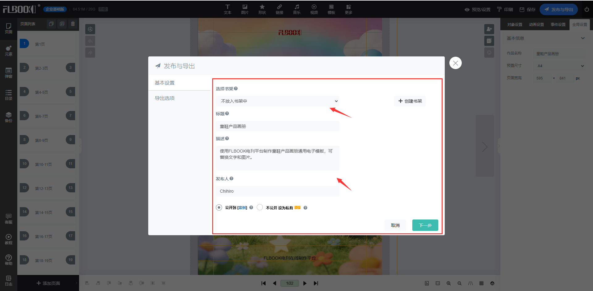 设置电子书的封面、书名、作者、LOGO等基础信息。也可以调整翻页效果、背景色等个性化细节。