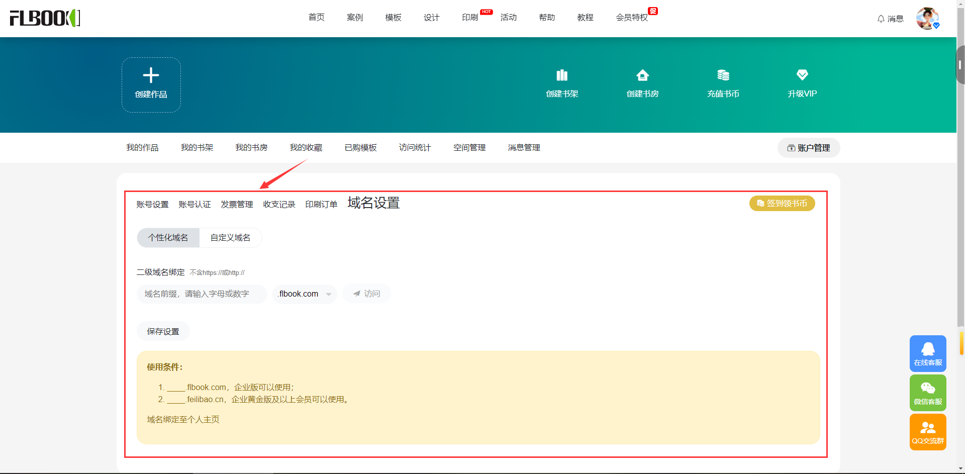 高级设置:付费用户可自定义域名、去除FLBOOK水印,设置访问密码(保护敏感汇报内容)。